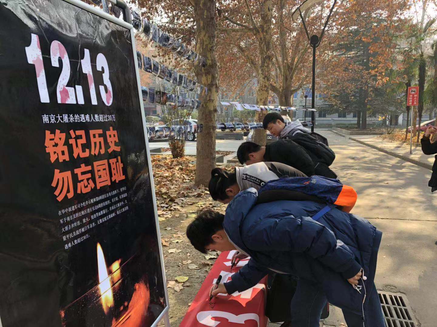 2018年12月13日是第五个南京大屠杀死难者国家公祭日。为教育员工牢记历史、勿忘国耻,凝聚力量、奋力拼搏,信誉最好的十大体育平台艺术与传媒公司于2018年12月13日13:00在金花校区喷泉广场举办“12.13牢记历史,勿忘国耻,振兴中华”图片展和签名活动。