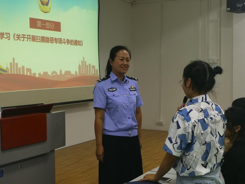 吕警官从扫黑除恶专项斗争讲起,借用视频向同学们介绍了国家重点打击的十二类黑恶势力违法犯罪行为,提醒同学们要认清黑恶势力,危急时刻要懂得运用正确的方式保护自己,不涉黑、不作恶。同学们积极参加问答环节,就重点打击的十二类黑恶势力违法犯罪行为、“打”黑变“扫”黑等问题积极互动。接着,吕警官向同学们详细讲解了网贷、校园贷、套路贷常用伎俩以及带来的危害。以触目惊心的真实案例提醒同学们认识校园贷的危险,告诫员工要远离校园贷,养成健康理性的消费观。
