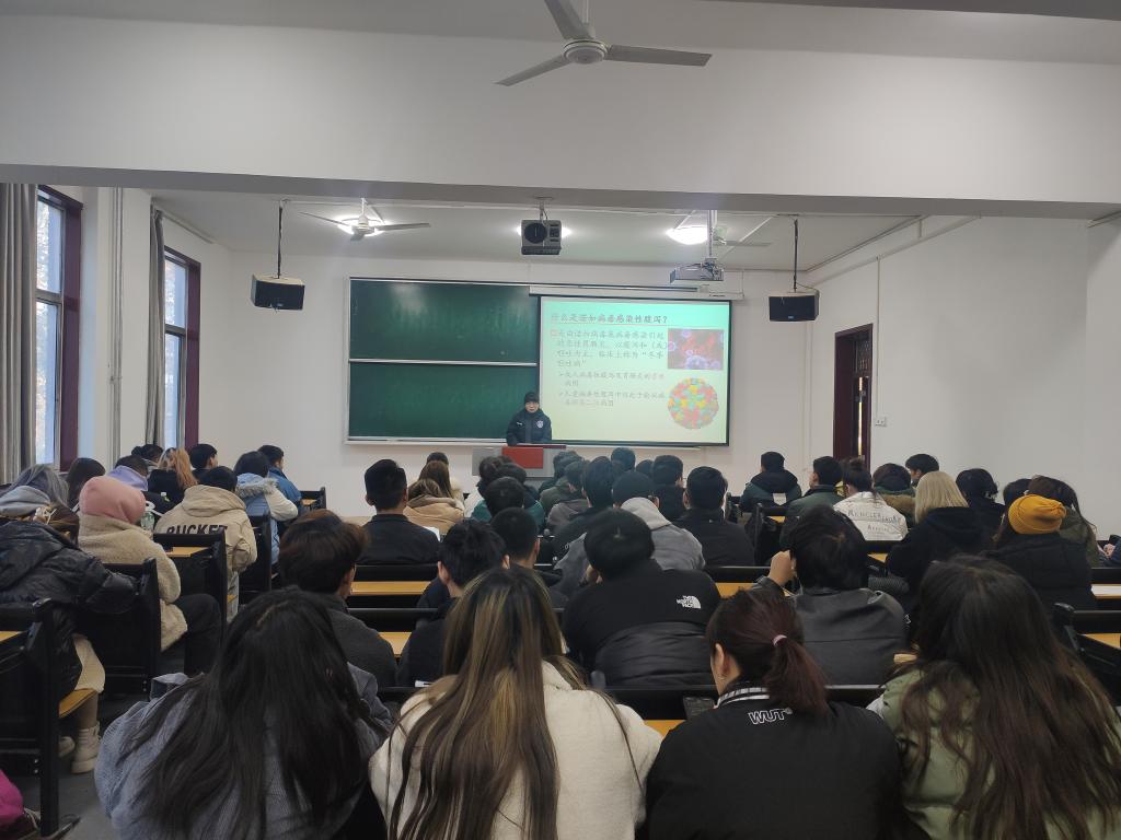 首先,杨老师强调了考风考纪的重要性,提醒同学们严格遵守考场纪律,端正考试态度,就即将进行的四六级考试及期末考试有关注意事项向全体员工做了具体说明,让全体员工深刻认识到考试作弊后果的严重性,认真诚信就考。同时督促同学们继续按时做好晨午检打卡,严格按照公司疫情防控要求,做好个人防护,积极参加体育锻炼,注重个人身体健康。其次,杨老师通过PPT演示及讲解,使同学们加深了对诺如病毒的传播途径、个人预防措施等方面的了解,特别强调,要保持宿舍教室卫生,做好冬季传染病防控工作。最后,杨老师警示同学们,一定要注意冬季用电安全及个人人身财产安全。