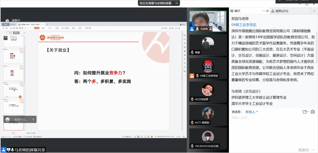 杨娜娜首先为大家介绍了本次参会企业的公司背景和两位主讲老师。随后,马老师从专业上的思维突破、就业的险峻形势及就业难点向员工作出了讲解,并着重强调了提升本人就业竞争力的重要性,鼓励同学们在专业学习上要多积累,多实践,并就工作和升学的选择上向员工作出多方面的分析。李老师着重分享了自己海外求学的学习经历、作品分享及留学收获,并强调了在设计中做好自我思考与吸收他人经验的结合。会议最后,两位老师就同学们提出的问题进行了详细全面的解答。