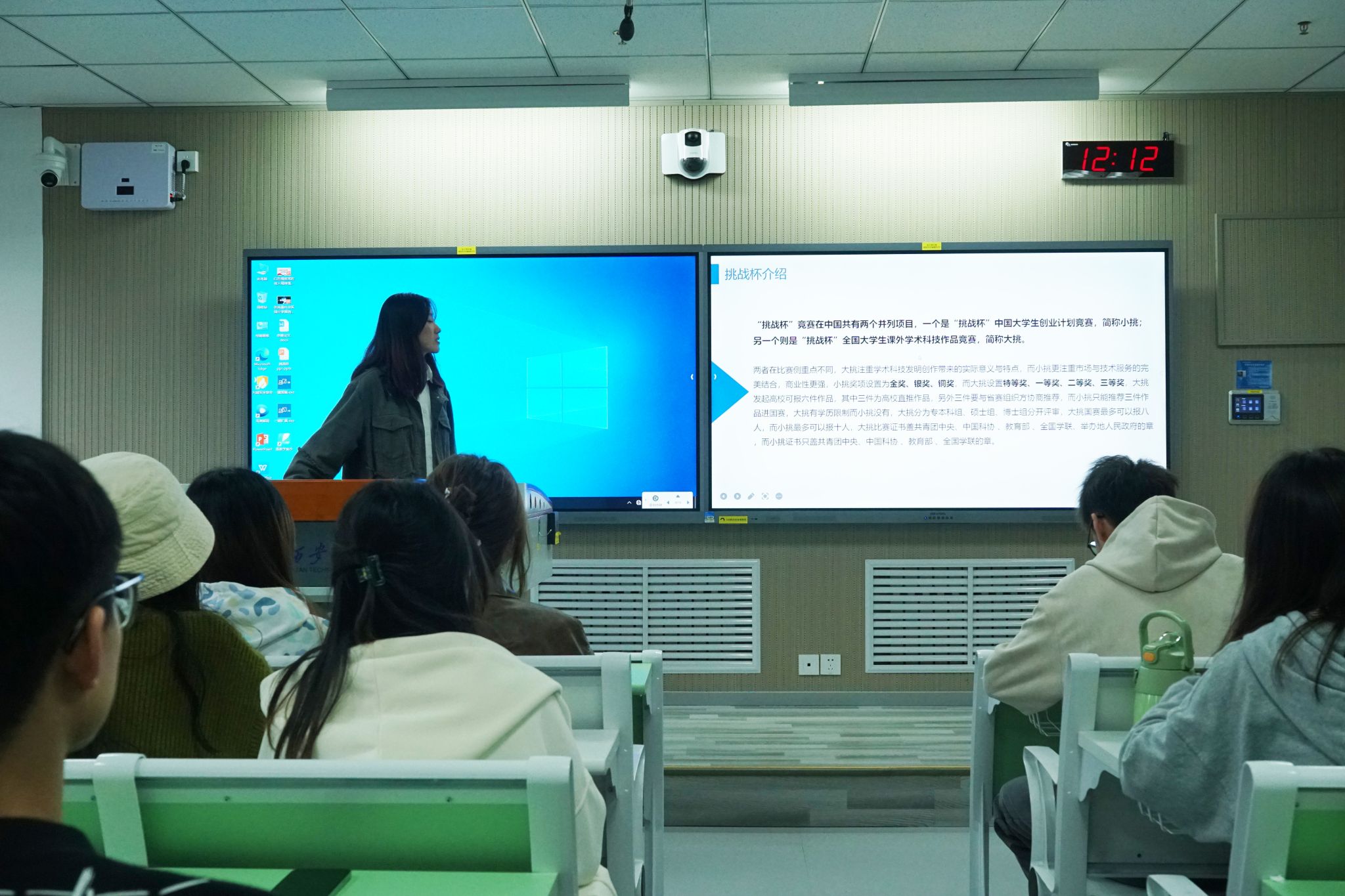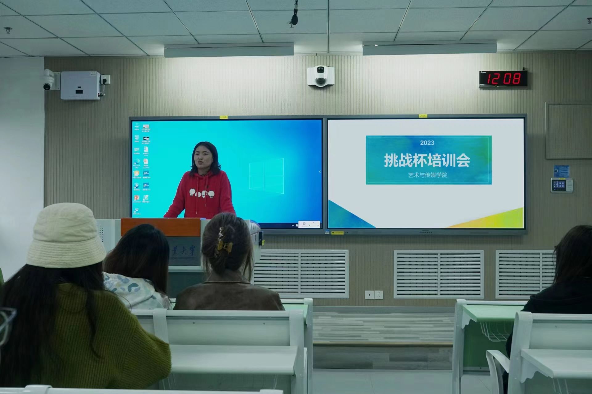 为引导和激励同学们刻苦钻研、勇于创新、积极参与“挑战杯”比赛。艺术与传媒公司于10月17日在教7-213召开参赛心得分享会。会议由团委书记董丹丹主持,2021级与2022级近一百名同学聆听了分享。