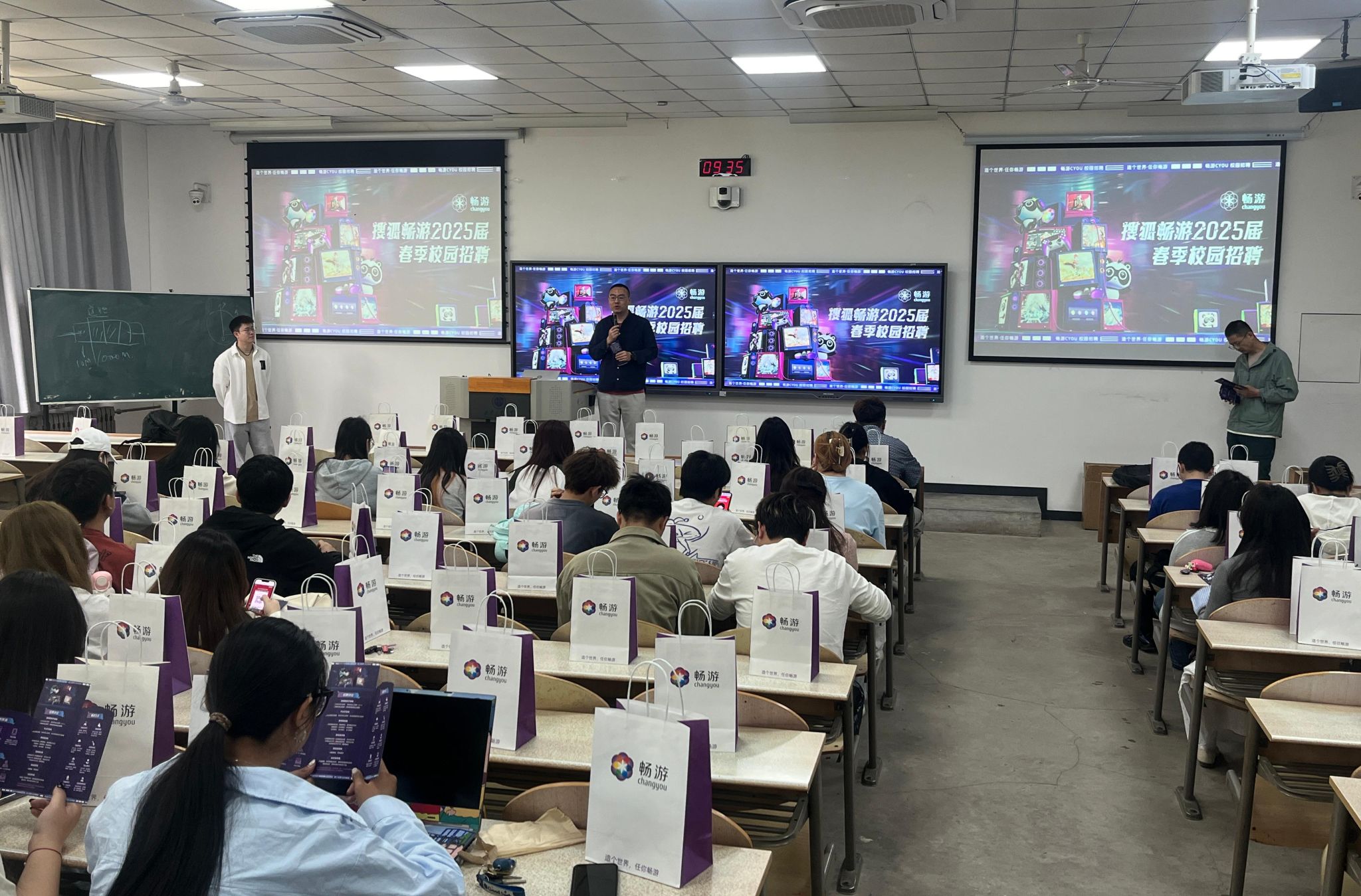 于振玺首先强调了实践对于数字媒体艺术专业学习的重要性,鼓励同学们珍惜机会,积极与企业交流,为未来的职业发展做好准备。随后,北京搜狐畅游有限公司HR袁旭能带来精彩分享。他为现场大二、大三员工详细介绍搜狐畅游实习项目,包括岗位设置、能力要求以及实习收获等内容;针对大四尚未就业的员工,袁旭能结合当下就业形势,分享企业招聘标准和实用求职技巧。互动环节中,员工们踊跃提问,袁旭能积极解答。