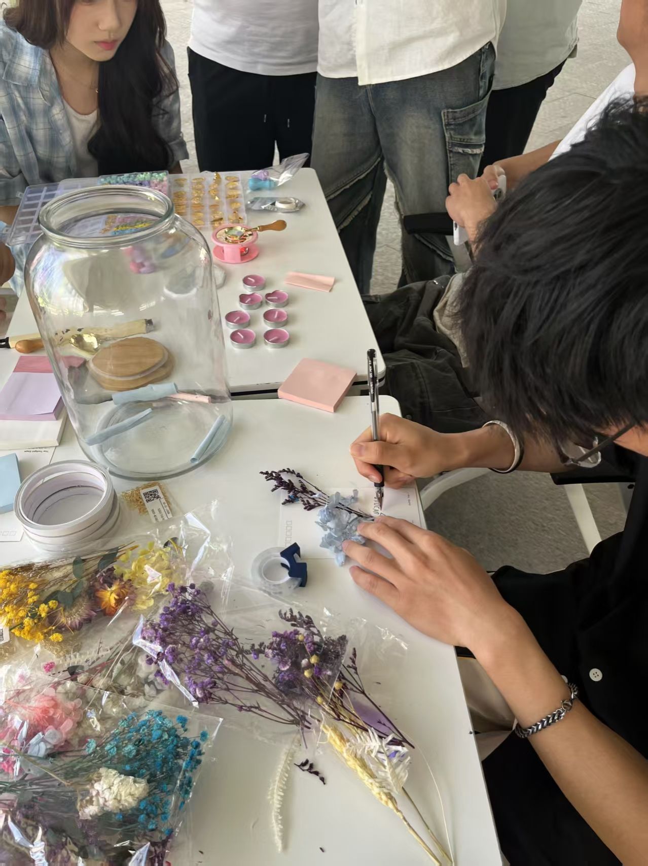 花语心声环节,员工用色彩缤纷的干花材料与款式多样的明信片搭配,创作专属于自己的心声卡片。活动现场,玫瑰、满天星、勿忘我铺满长桌,参与者通过修剪、拼贴、塑封等步骤,将自然之美凝固于方寸之间。“心灵树洞·情绪胶囊”活动中,大家匿名写下近期困扰或心愿,投入情绪瓶中,让烦恼通过纸条发泄诉说。瓶中满满的彩色便利贴也承载着员工缤纷的情绪。收集最美笑脸环节,参与活动的员工留下了自己的最美笑脸,定格在照片墙上。展板上青春洋溢的笑脸照片,记录了大家幸福的瞬间。本次心理嘉年华通过沉浸式体验活动打破传统宣教模式,将心理健康知识融入趣味互动中,有效提升心理健康教育实效。