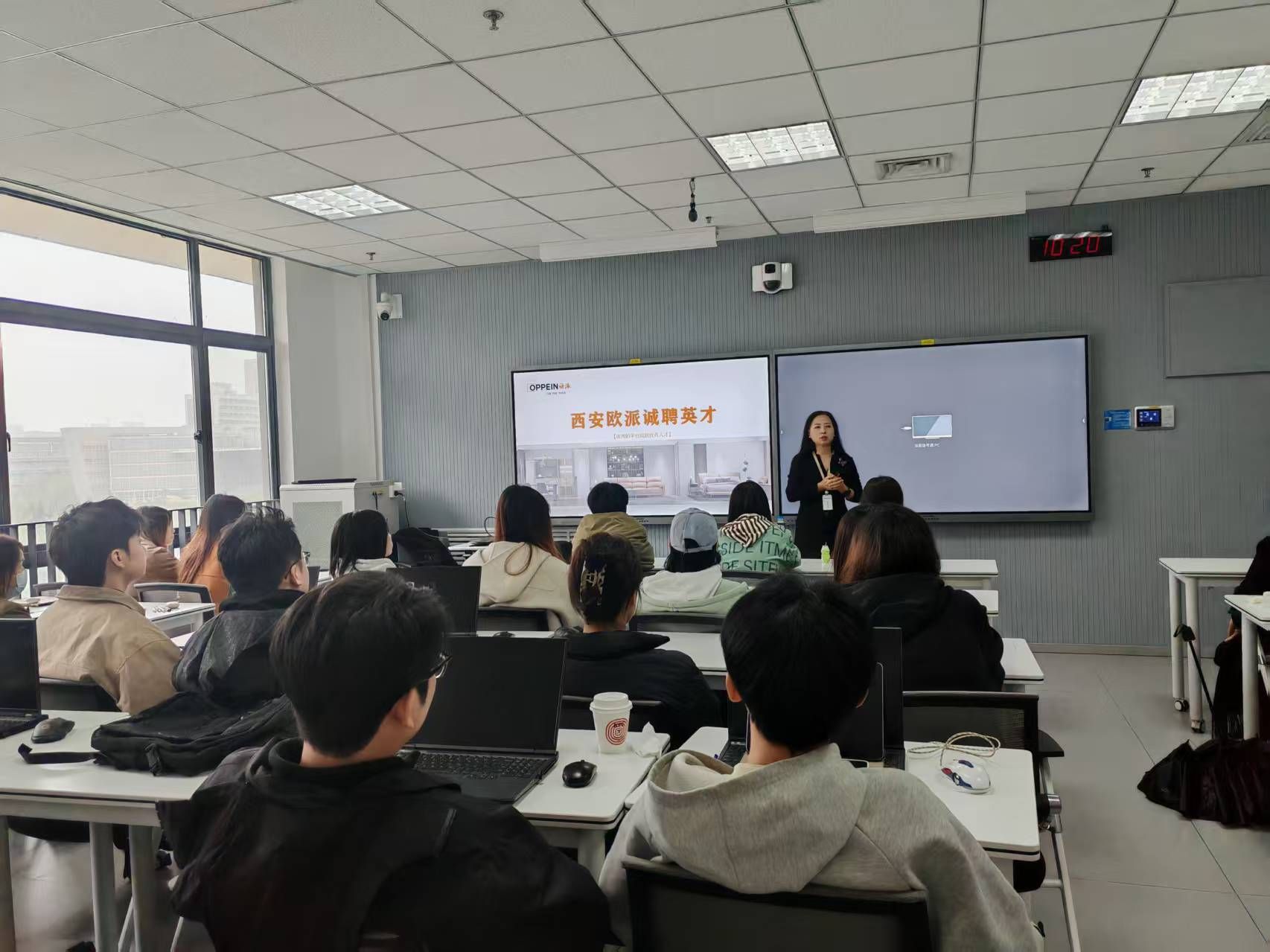宣讲会上,郭晓辉首先介绍了欧派公司作为国内家居行业领军企业的发展历程、企业文化和行业地位。随后郭晓辉详细讲解了公司的意向招聘岗位、软件能力要求、职业发展路径及薪资待遇体系。公司拥有完善的员工培训和导师带教制度,可为新人提供全面的职业成长支持。