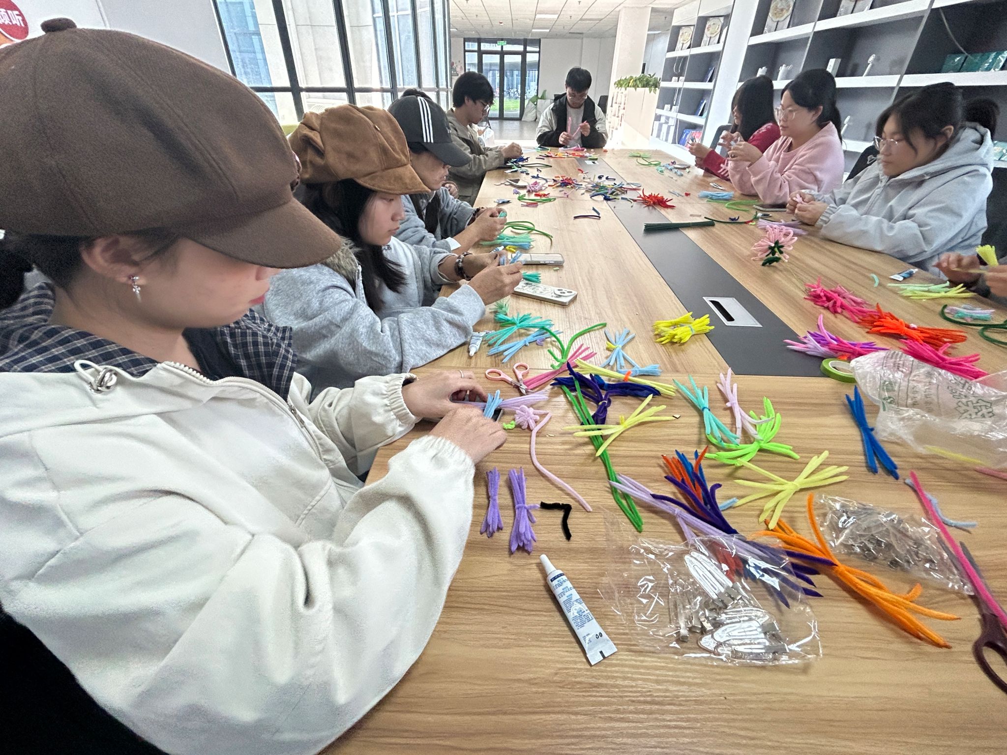 在动手环节中,员工们在“一对一”指导下创作出各具特色的扭扭棒菊花,并合影留念,现场洋溢着成就感和文化氛围。