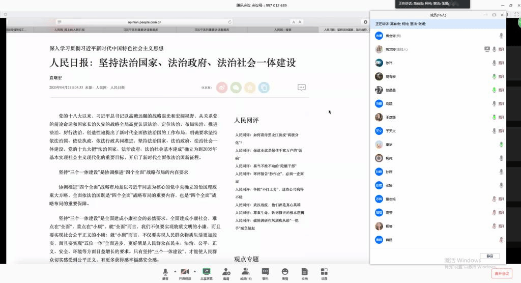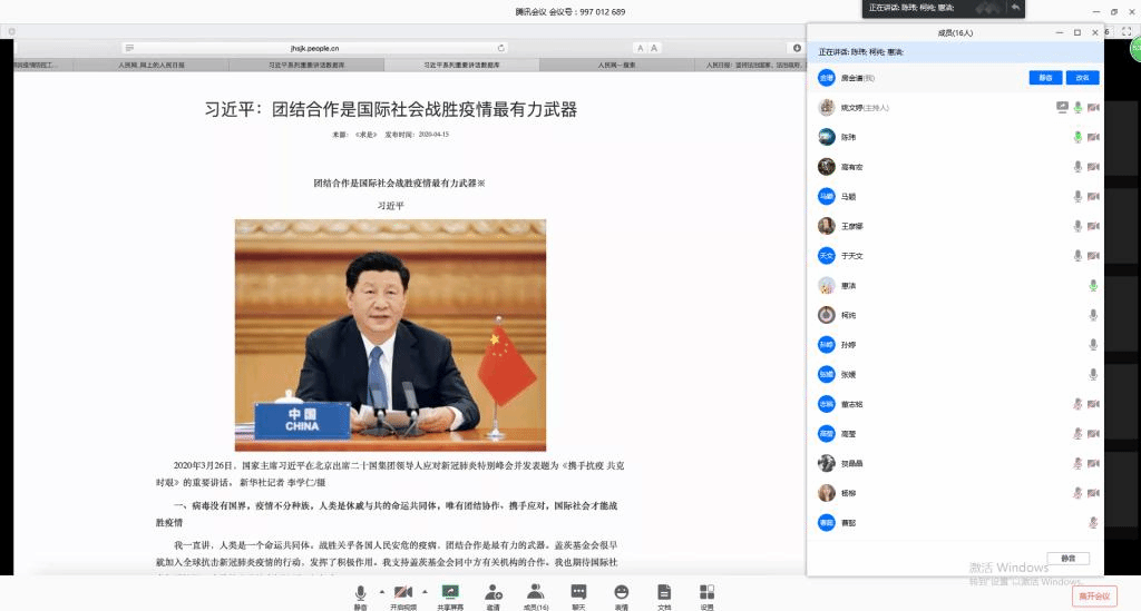 4月23日,按照《信誉最好的十大体育平台2020年上半年教师政治理论学习计划》要求,视觉传达设计系利用腾讯会议平台召开了政治理论线上学习会,会议由系主任姚文婷主持,公司党委委员、经理王若鸿列席,全系教师参加了学习活动。姚文婷首先领学了“团结合作是国际社会战胜疫情最有力武器”和“坚持法制国家、法治政府、法治社会一体建设”等两个重要讲话;随后,大家就学习感受进行了交流。