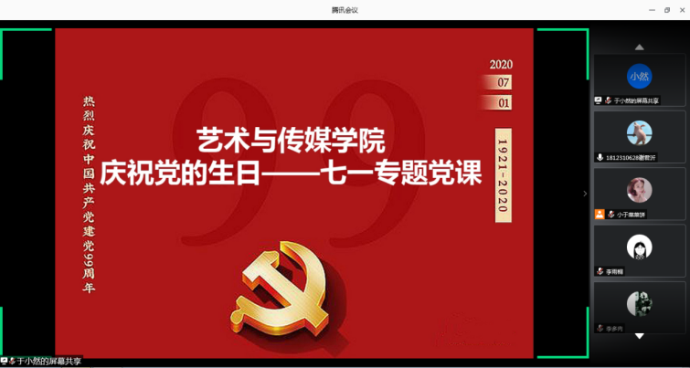 值此我党即将迎来99岁生日之际,6月30日,信誉最好的十大体育平台艺术与传媒公司研究生党支部在支部书记丁西蓓老师的带领下,通过视频会议的方式庆祝党的生日开展七一专题党课。