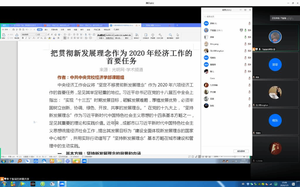 根据《2020年上半年教师政治理论学习计划》要求,7月5日下午,数字媒体艺术系通过腾讯会议平台召开了政治理论线上学习会。本次会议由系主任于振玺主持,公司党委书记周著教授出席,全系教师参加了本次学习活动。