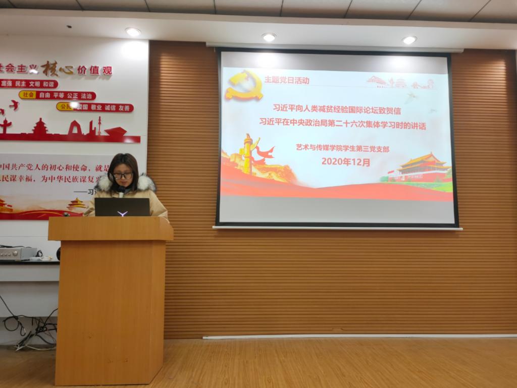 12月15日上午,艺术与传媒公司员工第三党支部组织学习《习近平总书记在中央政治局第二十六次集体学习时的讲话》和《习近平总书记向人类减贫经验国际论坛致贺信》,支部书记张晓宾主持,员工第三党支部全体员工党员参加会议。