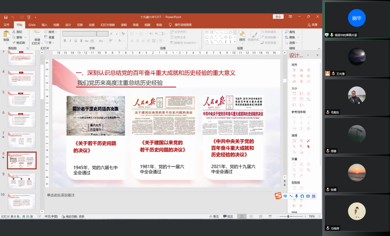 杨丽华杨老师从深刻认识总结党的百年奋斗重大成就和历史经验的重大意义、深刻认识党的百年奋斗的初心使命和重大成就、深刻认识中国特色社会主义新时代的历史成就、深刻认识党的百年奋斗的历史意义和历史经验、深刻认识以史为鉴等六个方面高屋建瓴的对十九届六中全会精神开展了宣讲。