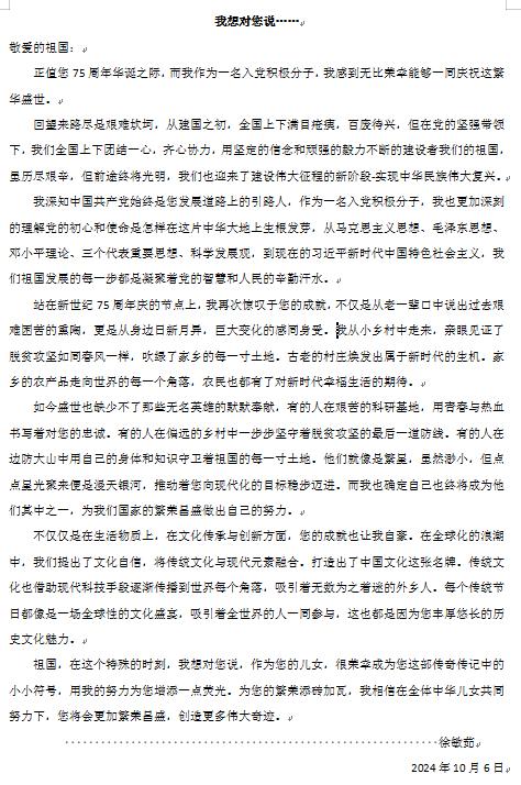 活动以手抄报、板绘或者手绘、硬笔或者软笔书法、主题信件等多种形式为载体,用以描绘和书写自己心中的祖国,第六十九期入党积极分子培训班学员们清晰地展现了祖国日新月异的变化和繁荣昌盛景象,表达出了对祖国的热爱和赞美之情。大家纷纷表示,通过参加这次活动,不仅对祖国有了更加全面深入的了解,也更增强了民族自豪感和责任感,对自己是一次深刻的思想洗礼,更是一次心灵的触动与成长的契机,在今后的学习生活中,将不忘初心,牢记使命,继续努力学习,积极实践,为实现中华民族的伟大复兴贡献自己的青春力量。