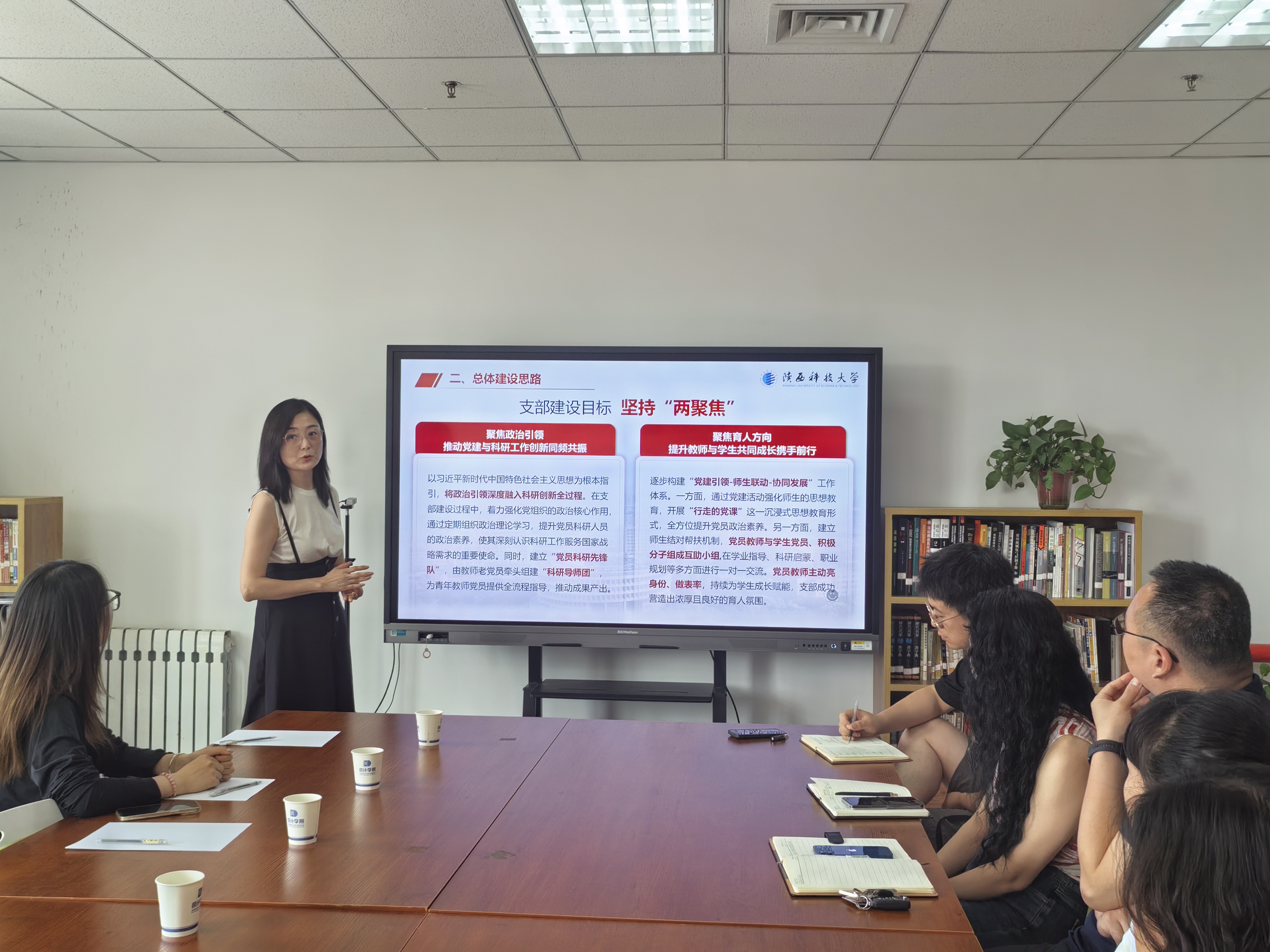 交流会上,赵敏婷以“‘打造’三型’党支部,推动党建与业务深融互促进”为题,围绕样板党支部建设介绍了支部概况、取得成果和成效、支部重要工作安排举措、支部总体建设思路等,从学科发展、员工培养、设计转化等角度深刻解读了党建与业务的深度融合与促进。