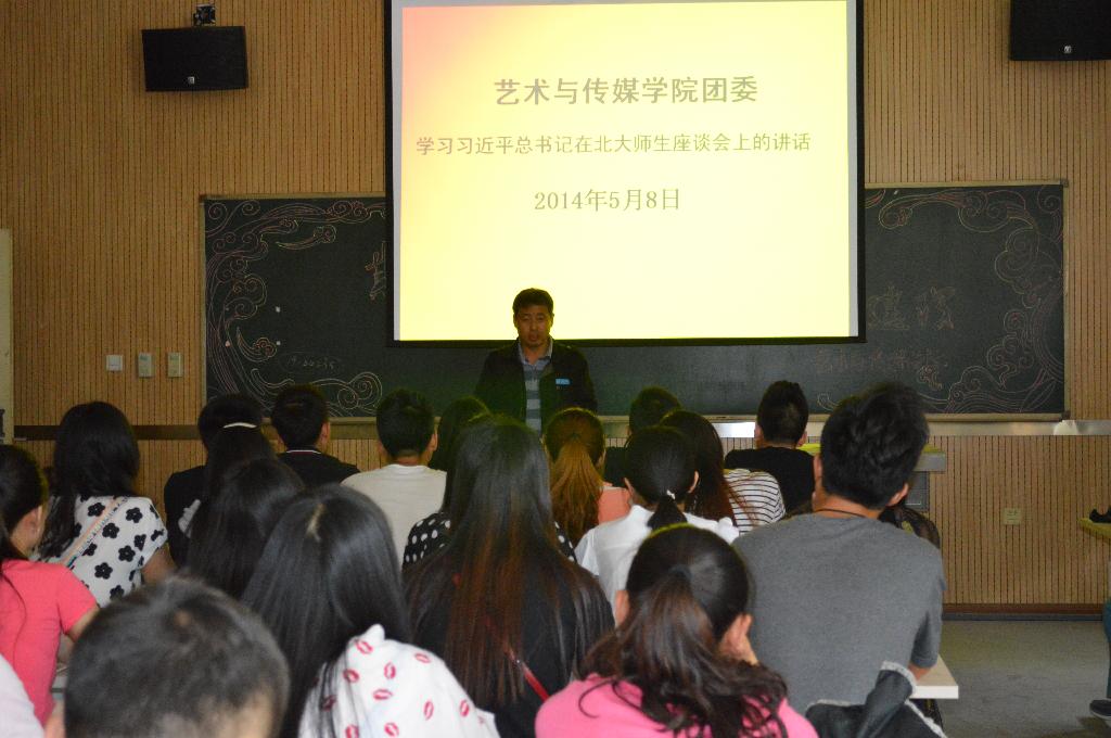 为深入贯彻学习习近平总书记的重要讲话精神,引导广大团员青年自觉践行社会主义核心价值观,2014年5月8日,艺术与传媒公司团委在教4-201组织学习习近平总书记在北大师生座谈会上的讲话,公司全体员工干部参加了学习会并交流了各自体会。