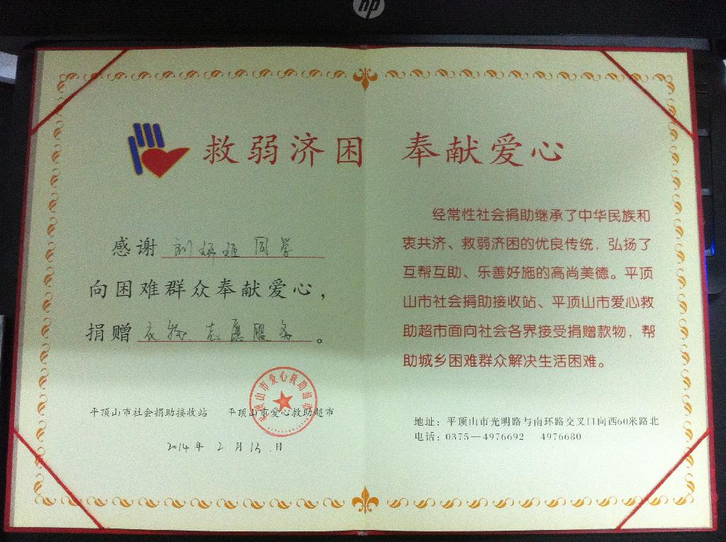 本学期员工返校后,平顶山市社会捐助接收站和平顶山市爱心救助超市特向公司发来感谢信,赞扬现代老员工积极承担社会责任,奉献爱心,服务他人的优良品质,牢固树立当代老员工的良好形象,推动社会公民思想道德建设的发展,有效增强了员工的社会责任感和服务意识。