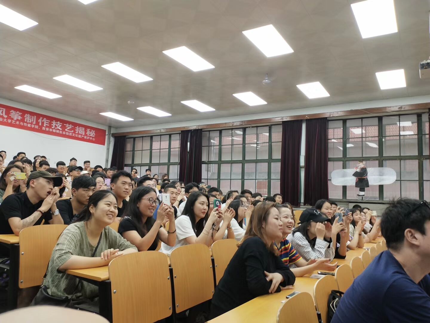 在两个小时的讲座中,张天伟老师不仅现场展示了秦始皇铜车马、公鸡斗架、皮影人物、猪八戒吃西瓜等形态各异的动态风筝作品,还讲述了他对动态风筝的热爱缘由,并揭秘了张氏风筝的风力机械传动装置构件制作技艺。张老师精湛的工学技艺和深厚的艺术素养,让广大师生近距离感受到动态风筝的魅力,也博得了大家热烈的掌声。