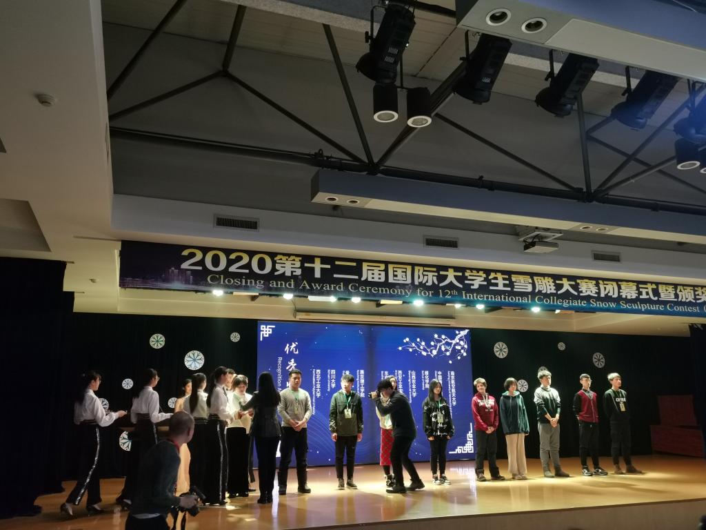 1月7日,由教育部工业设计专业教学指导分委员会主办,哈尔滨工程大学承办的2020第十二届国际老员工雪雕大赛闭幕式暨颁奖仪式在启航活动中心举行。经过3天的激烈角逐,艺术与传媒公司环境设计系王强老师指导,马腾、宁博方、支栋、黄蓓等同学创作的雪雕作品《为梦前行》成功入围决赛,最终荣获优秀奖。