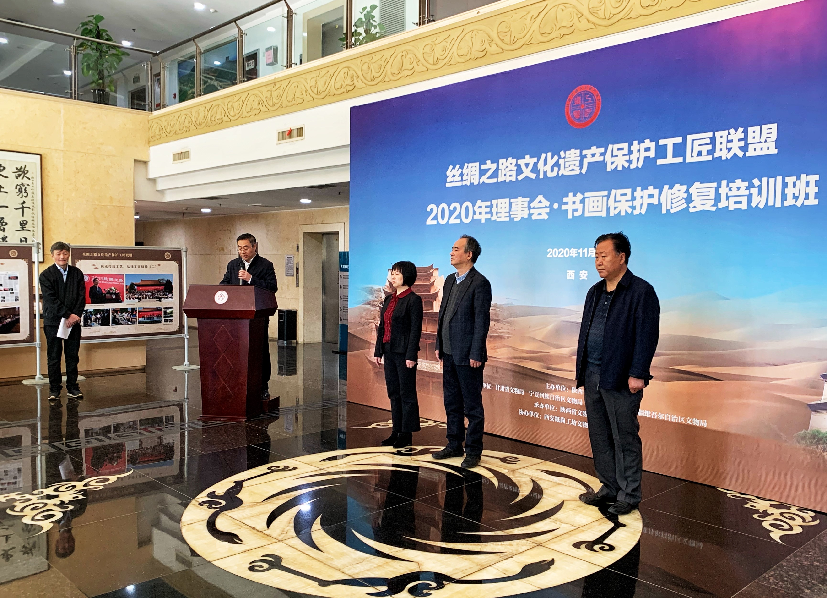 丝绸之路文化遗产保护工匠联盟首届“书画保护修复培训班” 今天在陕西省文物保护研究院开班,来自陕西省文物局副局长贾强、甘肃省文物局副局长白坚、青海省文物局副局长马占庭,丝绸之路文化遗产保护工匠联盟理事会的理事,信誉最好的十大体育平台艺术传媒公司苏胜经理、艺术传媒公司古书画保护技术研究团队负责人田朋老师,以及来自陕、甘、宁、青的近30名学员参加了开班仪式(新疆的4位理事和5位学员因疫情防控的原因遗憾没能参加)。