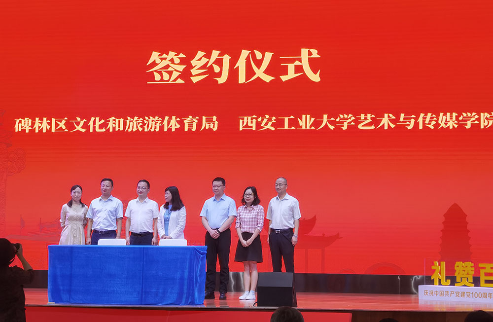 由中共陕西省委统战部、省委人才办、中共西安市委统战部、市委人才办指导,中共西安市碑林区委、碑林区人民政府、陕西省新的社会阶层人士联谊会主办,中共西安市碑林区委统战部、中共西安市碑林区委组织部、中共西安市碑林区委宣传部、碑林区文化和旅游体育局、碑林区环大学创新产业带管委会承办的“永远跟党走——艺心向党 礼赞百年”陕西省新的社会阶层人士庆祝建党100周年主题艺术展暨非物质文化遗产人才论坛活动于6月21日上午在西安创新设计中心隆重举行。艺术与传媒公司党委书记周著、副经理刘萍应邀参加了此次活动。会上,碑林区文化和旅游体育局局长徐琳还与公司刘萍副经理共同签署了“非遗创新人才联合培养基地”的协议,碑林区委组织部部长周振强、公司党委书记周著等上台见证了签约过程。