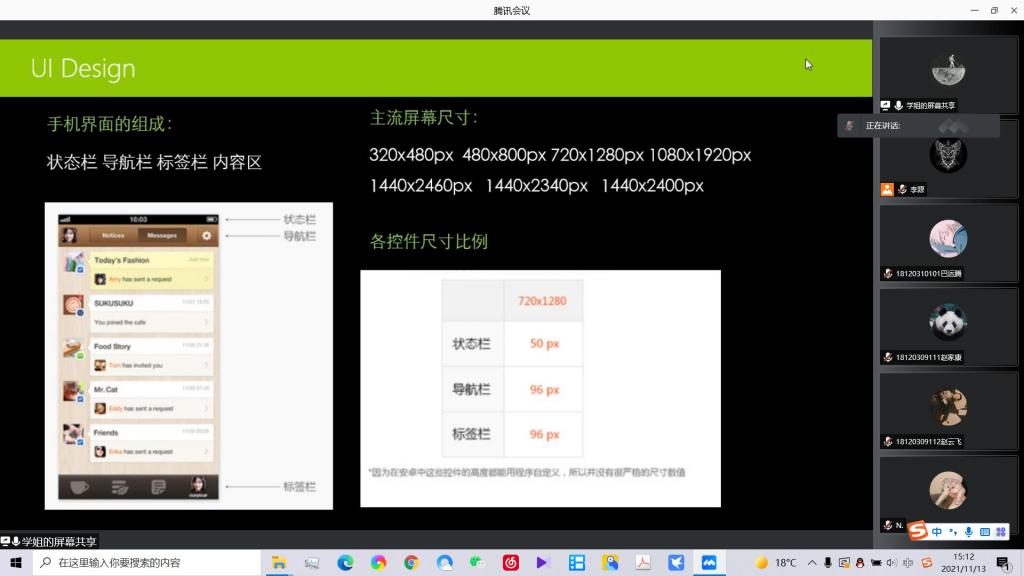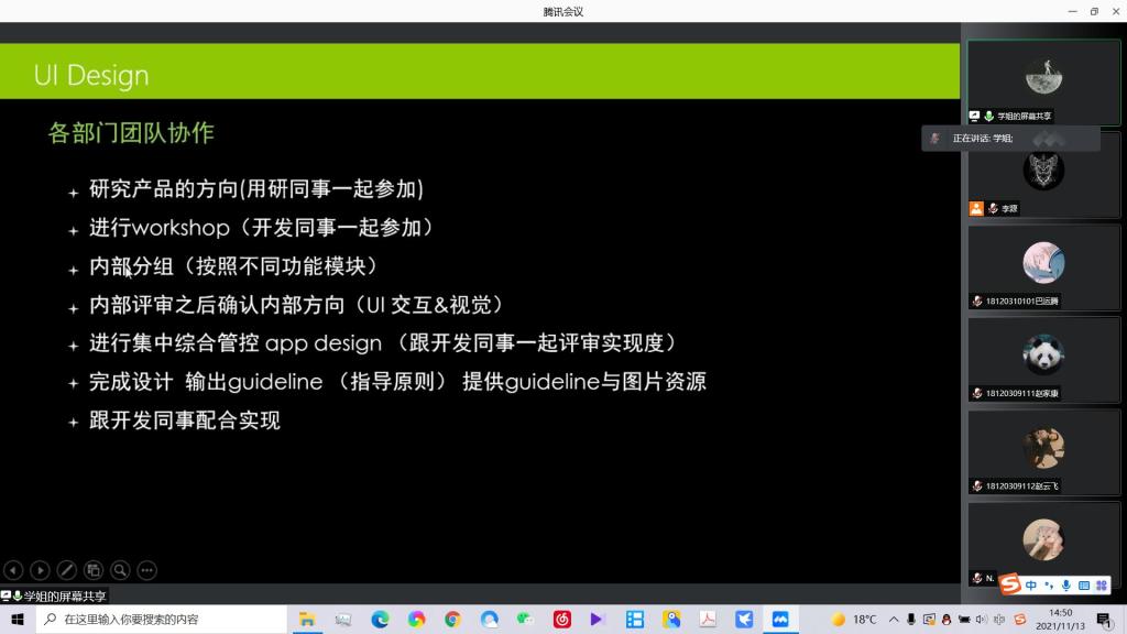 在历时两个小时的讲座中,颜虹设计师分别从认识UI、如何设计UI、企业中部门间如何协作、经典案例等多个方面向同学们做了详细介绍,分享了她对产品UI、互联网UI等多个细分领域在行业发展和设计方法上的经验与看法,同时结合今年实际情况,给2018级同学们分享了互联网岗位应聘中的环节和面试技巧。讲座结束后,线上同学们就UI设计领域相关的问题和疑问,积极踊跃地与颜虹设计师进行了提问、交流。