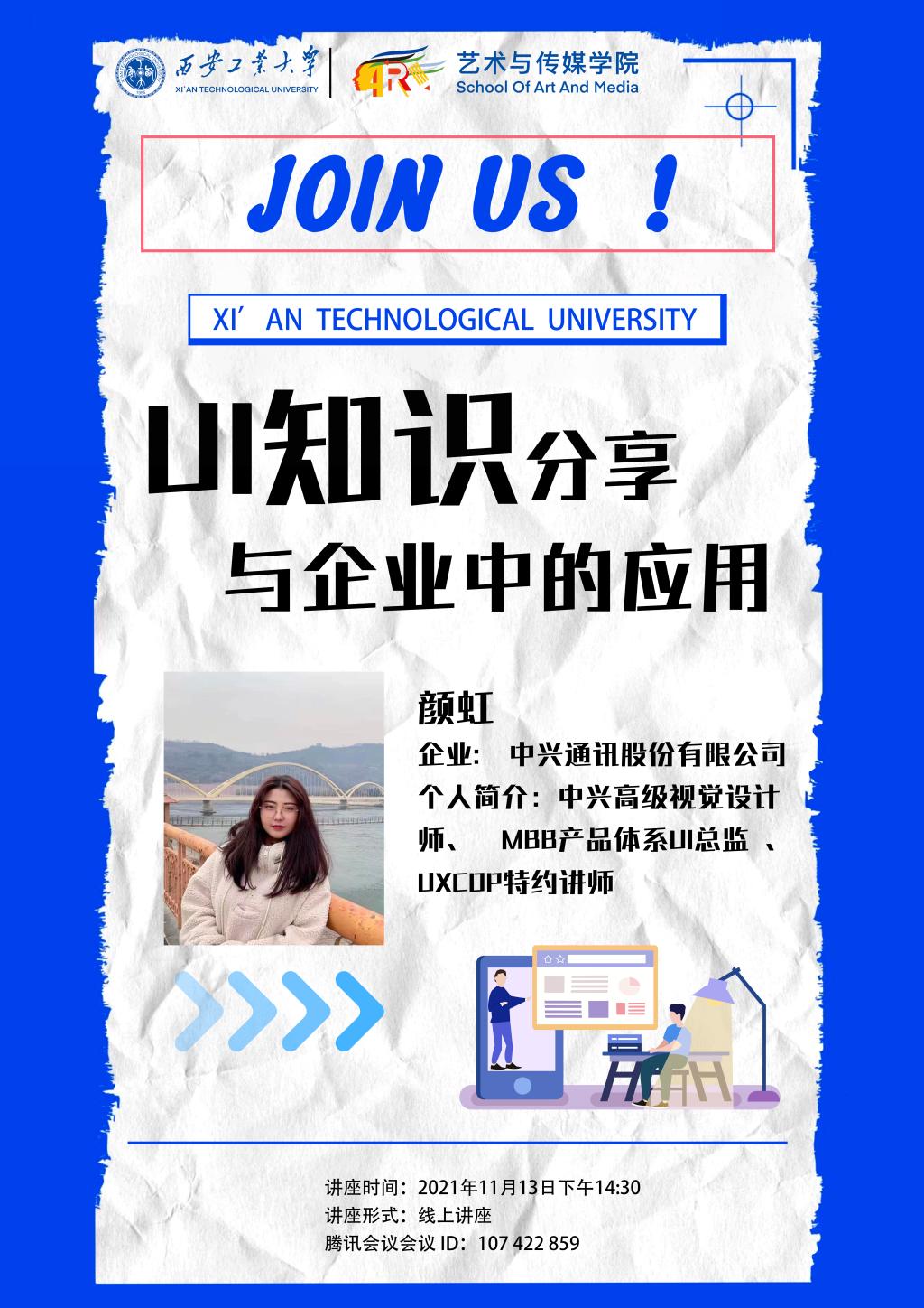 11月13日下午,艺术与传媒公司邀请到中兴通讯高级视觉设计师、MBB产品体系UI总监、UXCOP特约讲师、公司杰出员工颜虹在腾讯会议线上做了题为“UI知识分享与企业中的应用”主题讲座。产品设计系主任李源及产品设计专业本科生共计150余人参加了本次讲座。