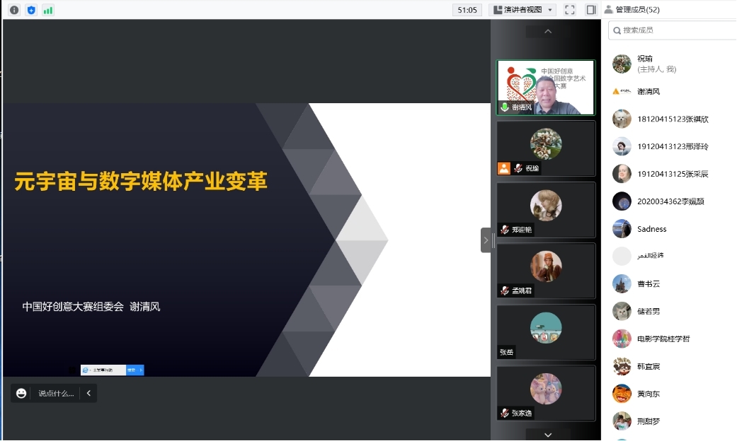 艺术与传媒公司祝瑜老师首先介绍了陕西赛区的参赛要求、稿件投递方式、目前的收稿情况。随后,中国好创意大赛创始人及大赛组委会秘书长谢清风应邀做了题为“元宇宙与数字媒体产业变革”专题报告最后,教育部动画、数字媒体艺术专业教学指导委员会委员、西安美术公司影视动画系黄向东教授做总结发言。