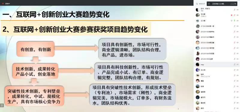 兰小毅历时两个多小时的讲座,结合自己多年创新创业教学经验,就互联网+创新创业大赛趋势变化、互联网+创新创业大赛参赛准备、互联网+创新创业大赛参赛等内容具体解析了互联网+创新创业大赛项目的培育及申报撰写要点。讲座最后,公司师生在线上与程文冬教授进行了热烈的互动和交流。