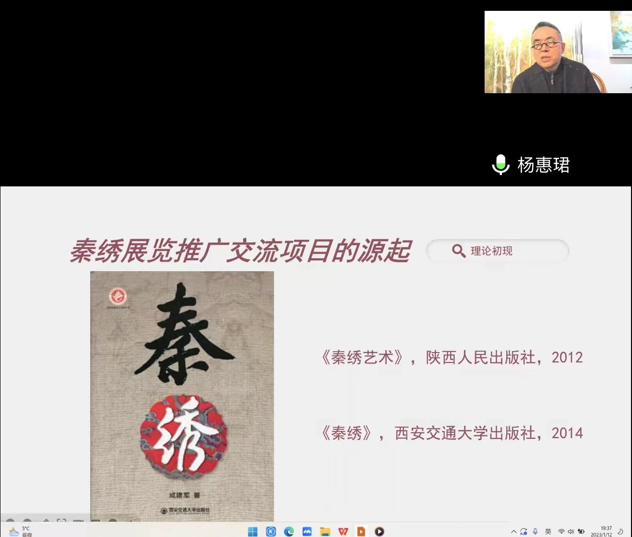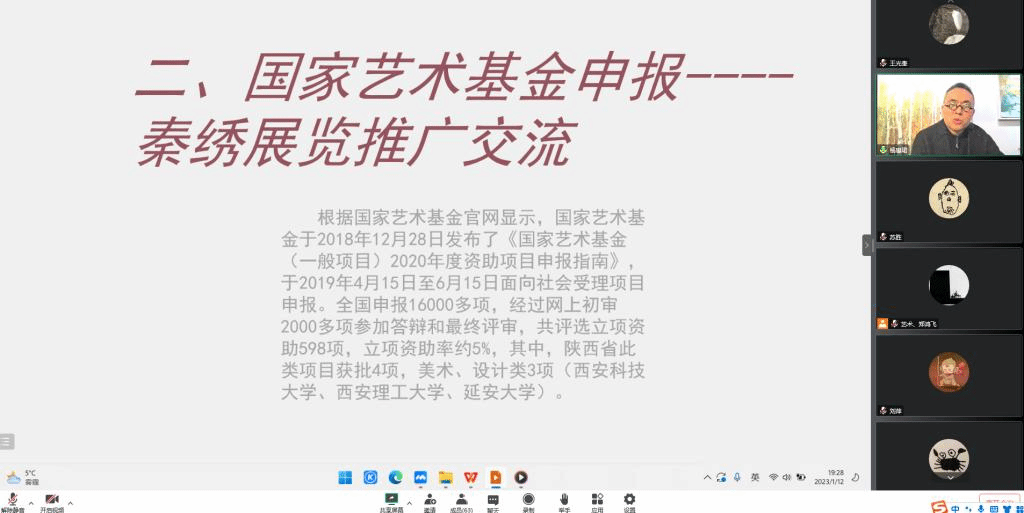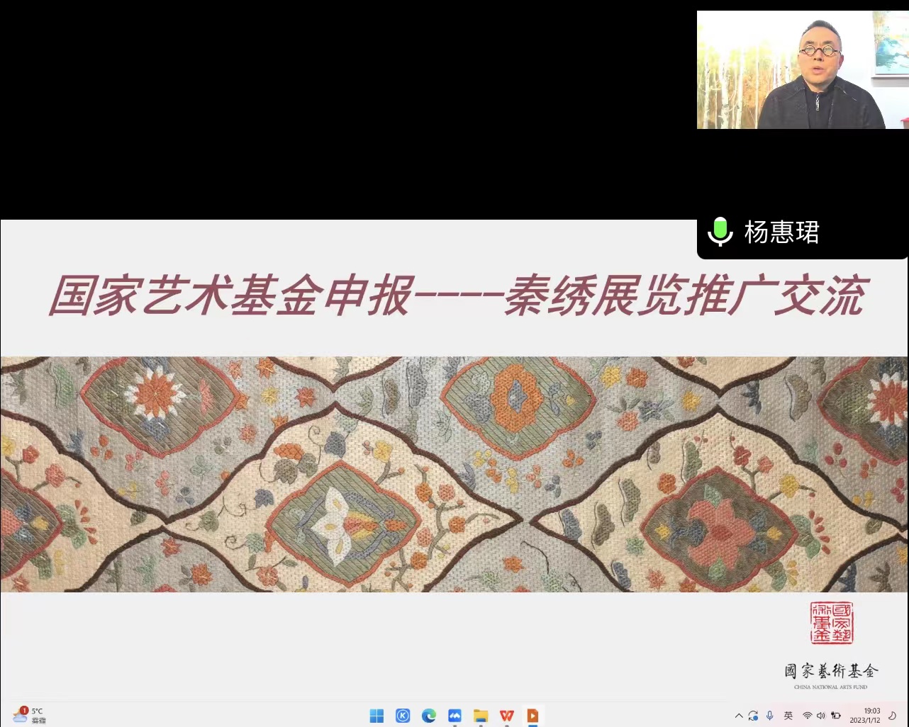 1月12日晚,公司邀请到西安科技大学艺术公司经理杨惠珺教授,在腾讯会议线上带来了题为“国家艺术基金申报——秦绣展览推广交流”的专题讲座。经理苏胜、副经理刘萍以及公司七十余名教师参加了本次讲座。讲座由经理苏胜主持。