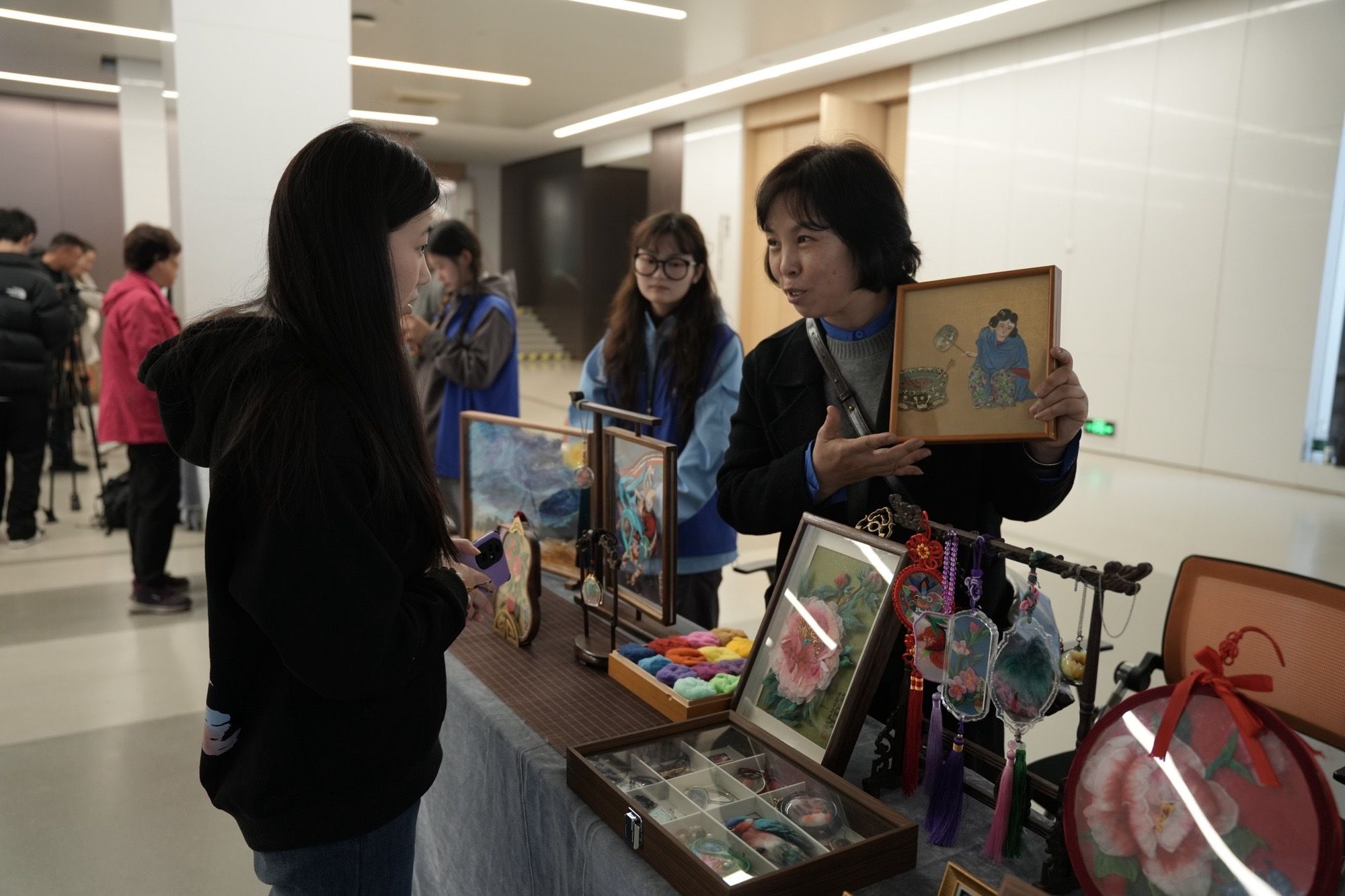 与此同时,非遗项目及文创产品展示活动在图书馆西展厅同步进行。展示区精心设置了非遗项目(包括核雕、棉絮画、不易香包、珠宝文创、酸梅粉制作、葫芦雕刻)及相关文创产品体验区,充分展示了非遗文创产品的最新成果,让广大师生得以近距离感受非遗的独特魅力。