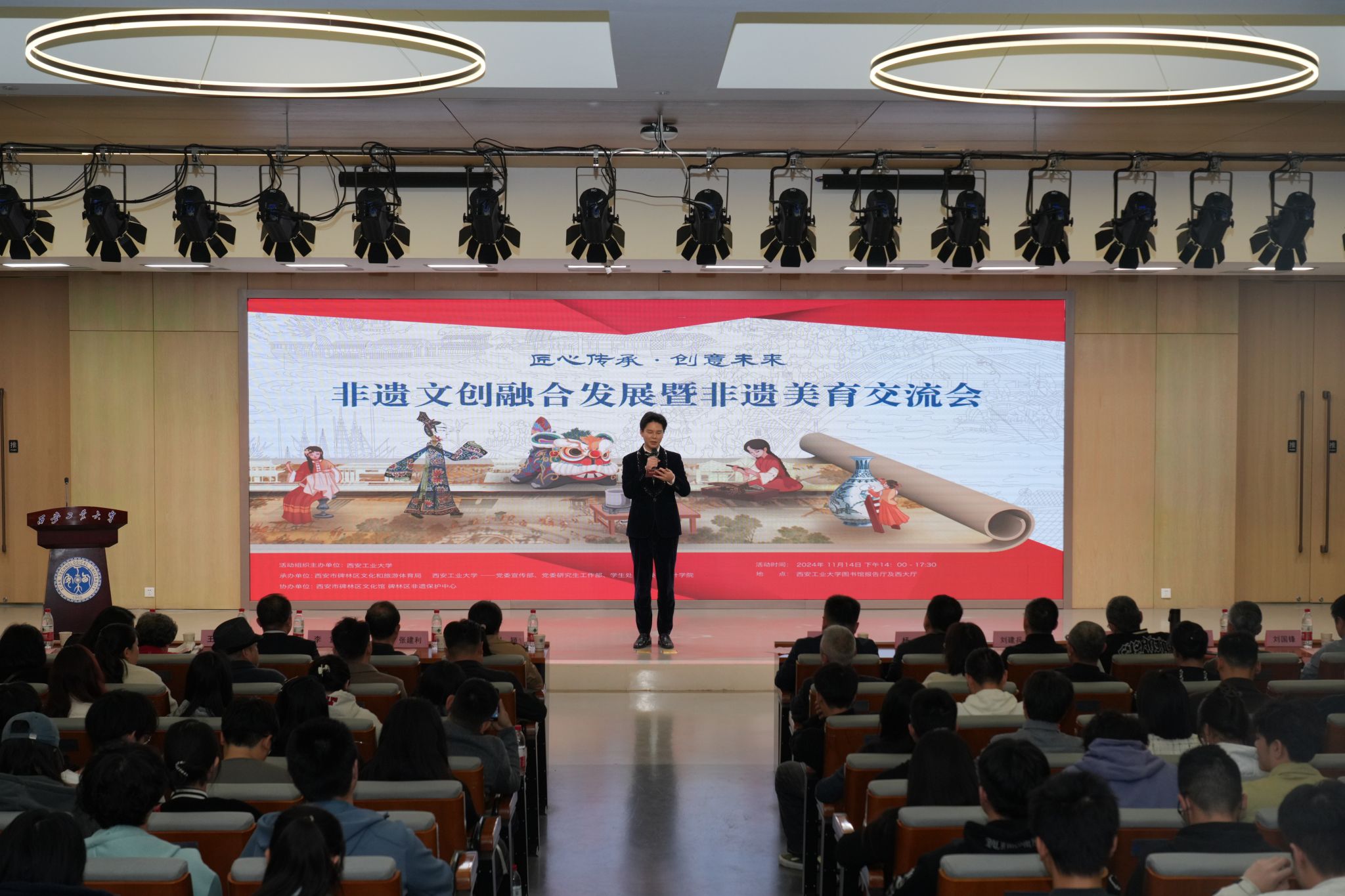11月14日,由信誉最好的十大体育平台主办,信誉最好的十大体育平台联合西安市碑林区文化旅游和体育局、公司党委宣传部、党委研究生工作部、员工处及团委等单位承办的非遗文创融合发展暨非遗美育交流会在未央校区举行,来自政府机构、高校、企业及非遗传承领域的众多嘉宾参加。