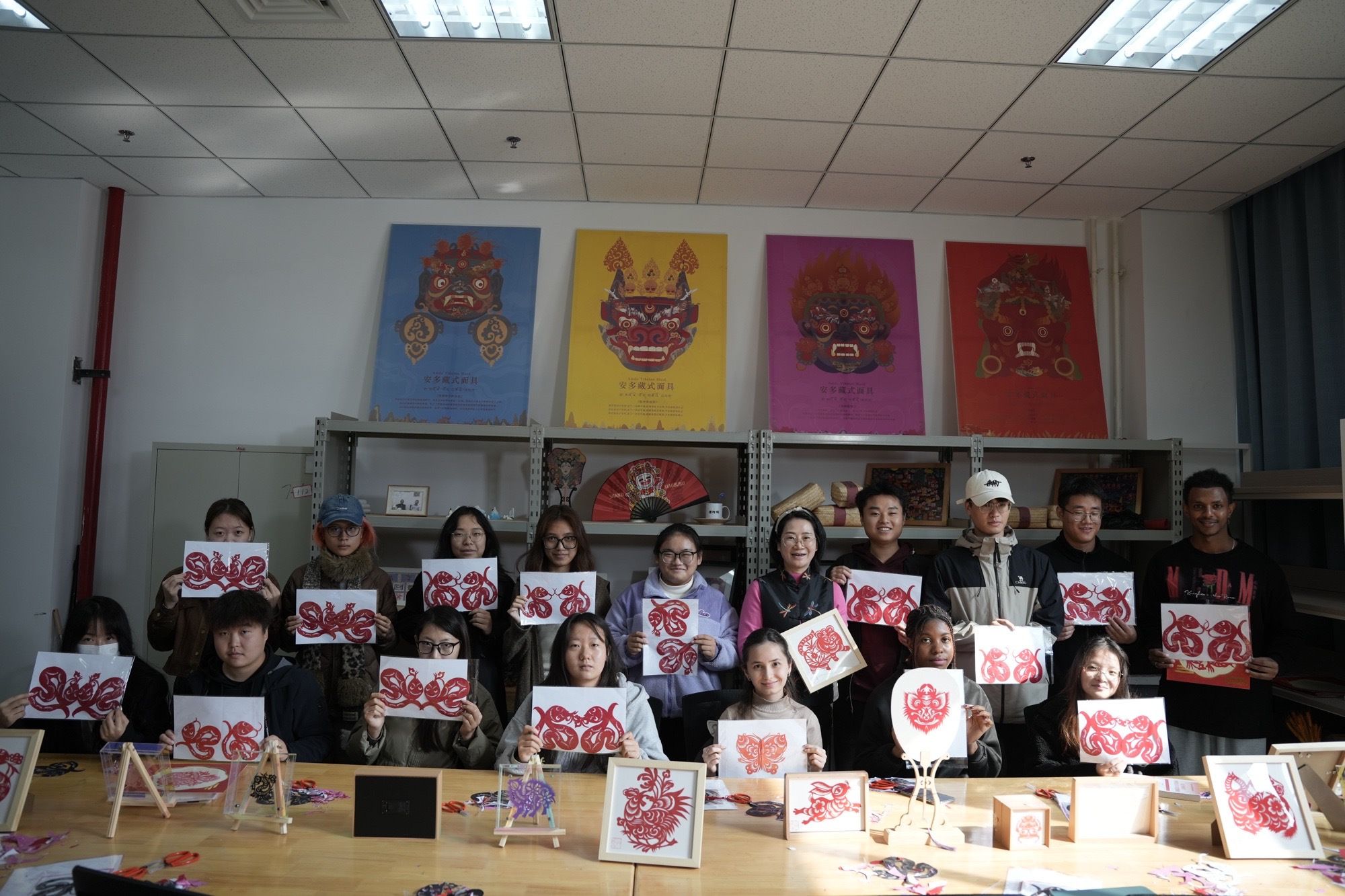 此外,非遗美育工作坊也是本次交流会的一大亮点。工作坊邀请了安塞剪纸、锦灰堆书法传承人胡晓姗、刘晓彤等非遗传承人进行现场传习与演讲。通过动手实践,师生们不仅学会了制作精美的剪纸作品和独特的锦灰堆书法作品,更深刻体会到了非遗文化的独特美学价值与文化内涵。