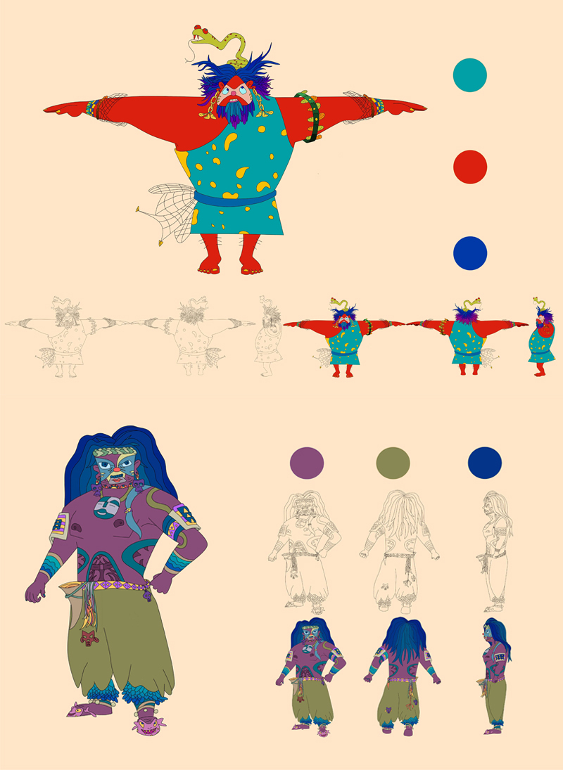 通过现代插画艺术风格进行角色、场景衍生开发设计和应用,半坡角色的衍生开发,是一种“再设计”,是对文化的重新审视、理解文化背景、融合半坡文化元素中蕴含的思想情感结合现代艺术风格,在半坡角色衍生设计一开始对于要呈现的角色形象是没有完整的概念的,很多灵感都是在草稿绘制过程中产生的,所以创作过程会不断地突破,不断地发现惊喜,改良新的角色。角色的衍生开发设计借鉴了中国传统民族文化与绘画风格,将归纳出的造型符号赋予角色。角色形象是依据原始生活中的社会分工等绘制,优化处理线条的细节,让其符合现代的审美标准,角色更加充实和有趣,具有半坡特色。半坡衍生场景以女巫为视觉中心,以水为祈福具体形式表现,连接各点组成捕鱼、祈福、狩猎、农耕等长卷绘制。根据移动媒体的流行趋势,确定画幅的长宽比以手机屏幕为主,显示比例是16:9。内容上从左往右分别是捕鱼、祈福、狩猎、农耕四个部分整体场景是一个完整首尾可拼合的整体,一方面能将整体角色更好的展现出来,另一方面传达敬畏自然与自然的和谐相处的思想观念。多样化展示了史前文化的魅力,能让更多人了解不一样的半坡文化。